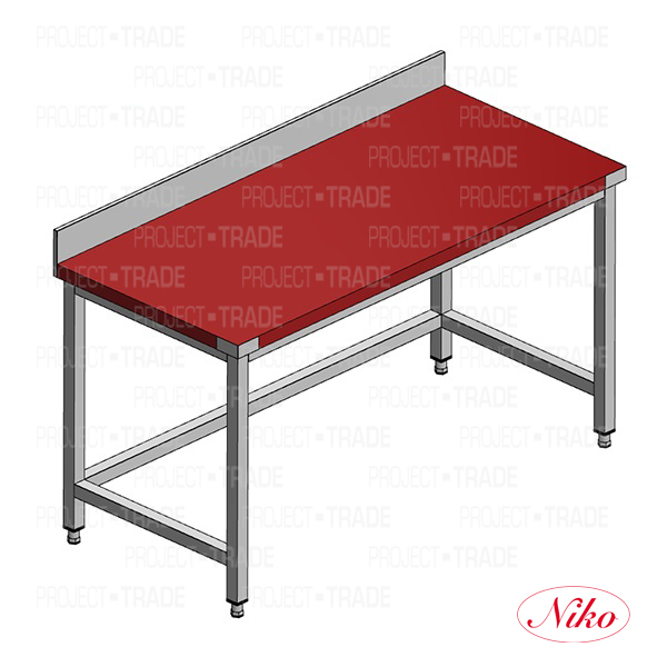 Frame made in stainless steel AISI304SB, worktop made in PE500, thickness of worktop is 40 mm, worktop is strengthened by aluminized stainless steel or by wooden pad, all components are glued under presses, height of rear splashback is 50 mm, table legs with adjustable height regulation, tables longer than 250 cm have 6 legs.